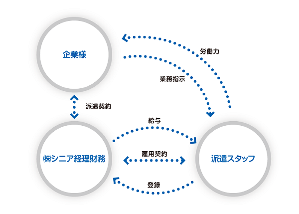 - 企業様(派遣先)、派遣スタッフ(派遣労働者)、シニア経理財務(派遣元)の三者で構成される仕組みです。